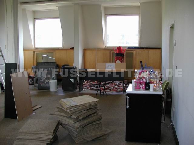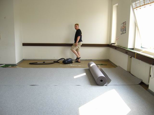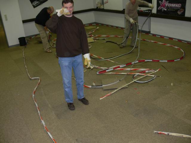 10.06.2008 | Als der alte Teppich raus war, der Untergrund frei von Teppichresten und sauber, könnten wir den neuen Rennbelag in aller Ruhe verlegen. |